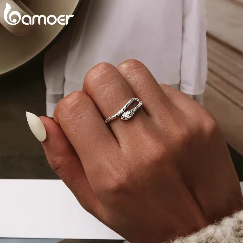 Entdecke den stilvollen BAMOER 925 Silber Ring – ein Schmuckstück mit Charakter: Schlangenmuster, eleganter Schnitt und ein glänzender grüner Zirkon-Stein machen ihn zum Blickfang. Der Ring verbindet hochwertige Materialien mit modischem Design und einem Hauch von Vintage-Charme.