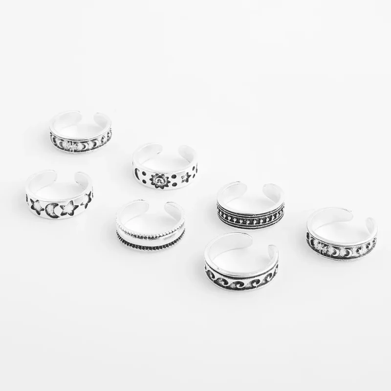 Dieses wunderschöne Fußring-Set besteht aus sieben filigranen Ringen im europäischen und