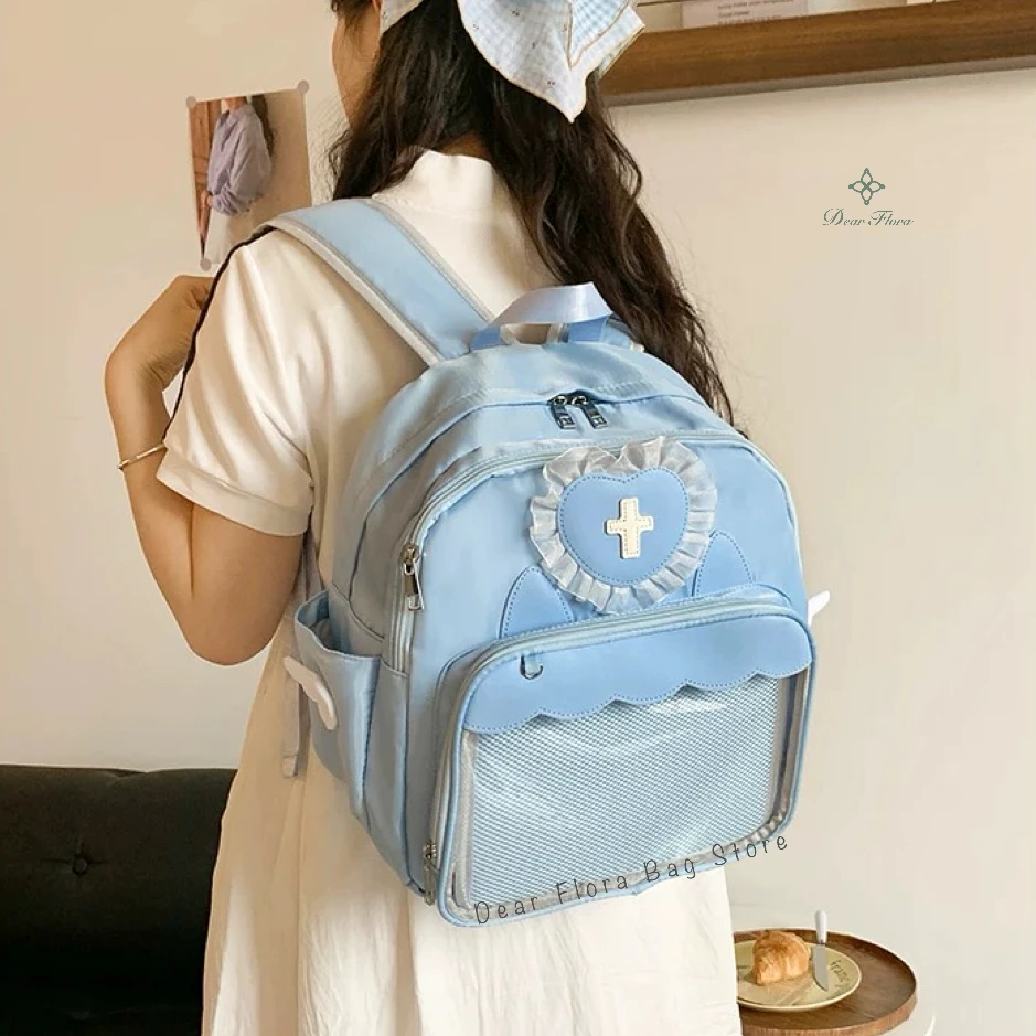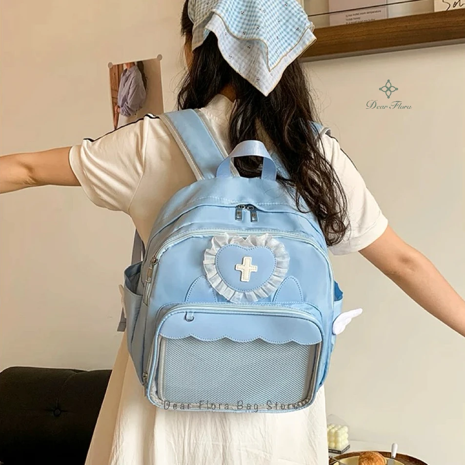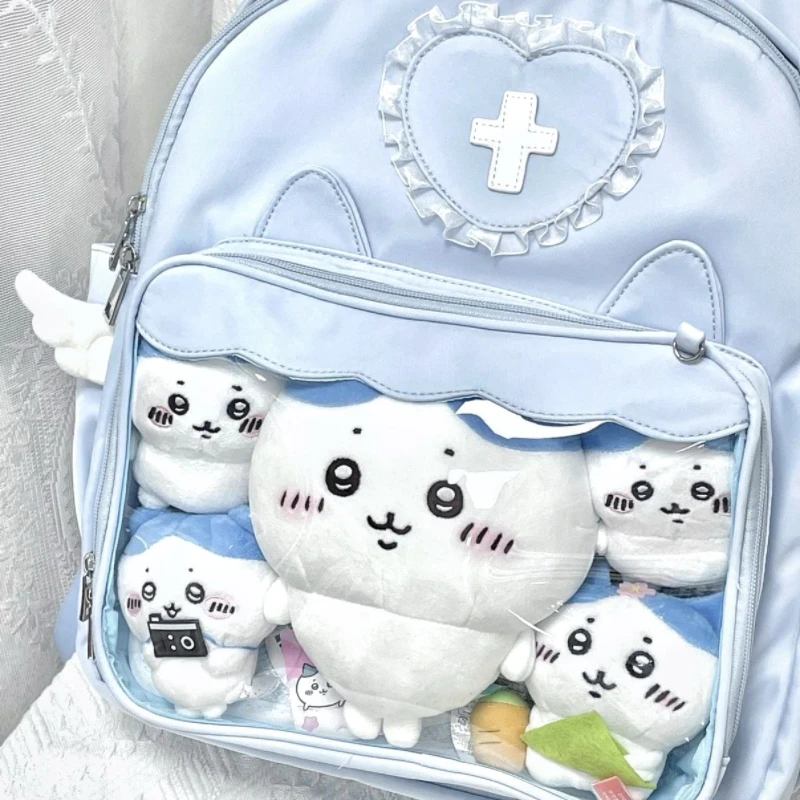 Süßer kawaii Rucksack für Mädchen im Y2K-Stil mit Kreuz-Design, transparentem Fach und viel Platz für Schule und Alltag.