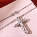 Dieses Design richtet sich an Frauen, die christlichen Schmuck mit luxuriösem Glanz lieben. Der Kreuzanhänger wirkt klassisch und modern zugleich und passt sowohl zu festlichen Outfits als auch zu einem stilvollen Alltagslook. Die eingesetzten Moissanit-Steine mit Größen von ca. 2,5 mm bis 5 mm verleihen der Kette eine auffällige, aber dennoch elegante Brillanz. Gerade als Geschenk zum Geburtstag oder zu einem besonderen Anlass ist diese Kette eine wunderschöne Wahl, weil sie Stil, Glauben und Wertschätzung in einem Schmuckstück vereint.